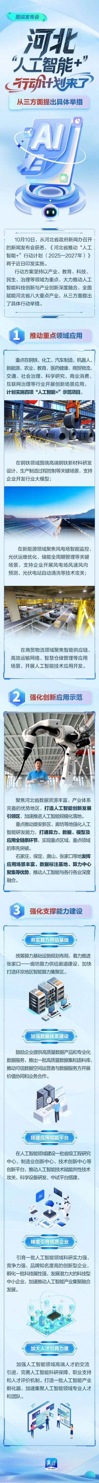 近年来,人工智能技术快速迭代,持续刷新着大众的生活体验和生产方式。从省政府新闻办10月10日召开的河北省推动“人工智能+”行动计划(2025—2027年)新闻发布会上获悉,《河北省推动“人工智能+”行动计划(2025—2027年)》(以下简称《行动计划》)于近日印发实施。
