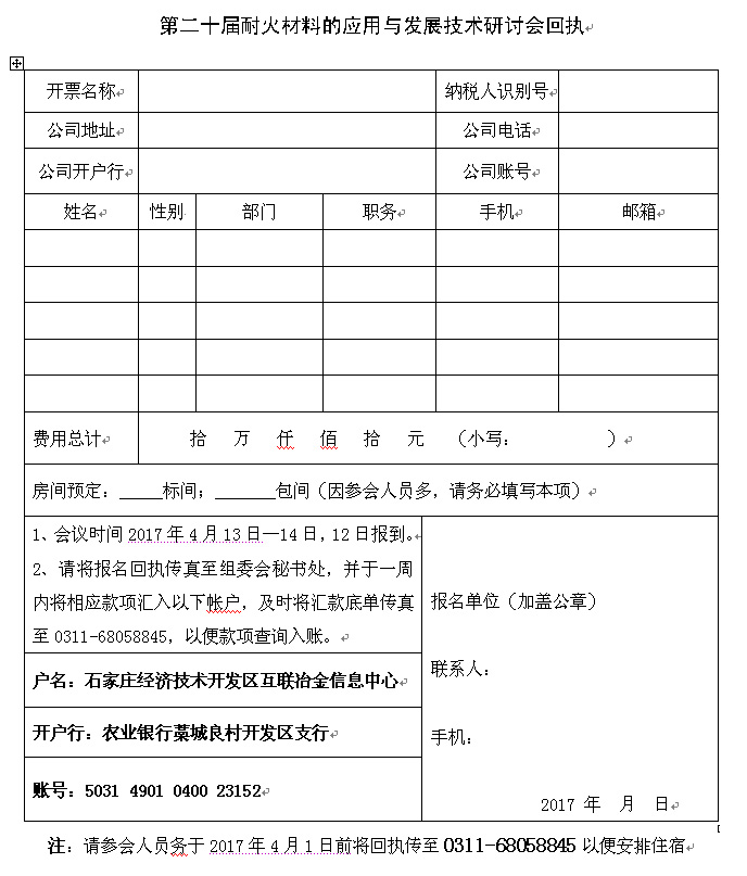 1、请参会代表务必于4月1日以前将参会回执传真至0311-68058845,或发电子邮件至yejinzb@163.com,以便我们妥善安排会务。