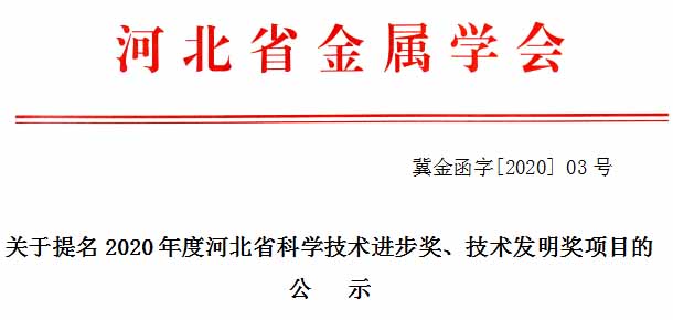 现将河北省金属学会提名2020年度河北省科学技术进步奖、技术发明奖等5个项目公示如下: 一、公示内容 1、 科学技术进步奖 ⑴提名号:239—401 多功能高效低耗钢铁烟气超低排放关键技术及其应用 ⑵提名号:239—402 锻造高速钢轧辊制造技术集成及产业化应用 ⑶提名号:239—403 吉帕级超高强钢高氢快冷及水淬工艺关键技术的开发与应用 ⑷提名号:239—404 热轧中宽带板形稳定控制技术研究与应用 2、技术发明奖 ⑴ 提名号:239—301 高端家电面板抗时效控制技术及创新应用 二、详细事宜 1、公示自2020年6月8日起至2019年6月15日止,在河北省金属学会网站发布。网址:http://www.hbsyjxh.org/ 。直接点击提名项目查看(附:提名项目公示内容)。 2、对公示内容有异议者可在公示截止日前向河北省金属学会提交书面意见,逾期不予受理。 3、公示联系人:朱广文 梁 玫 胡连菊 联系电话:13931891333、15613360136 13191856018