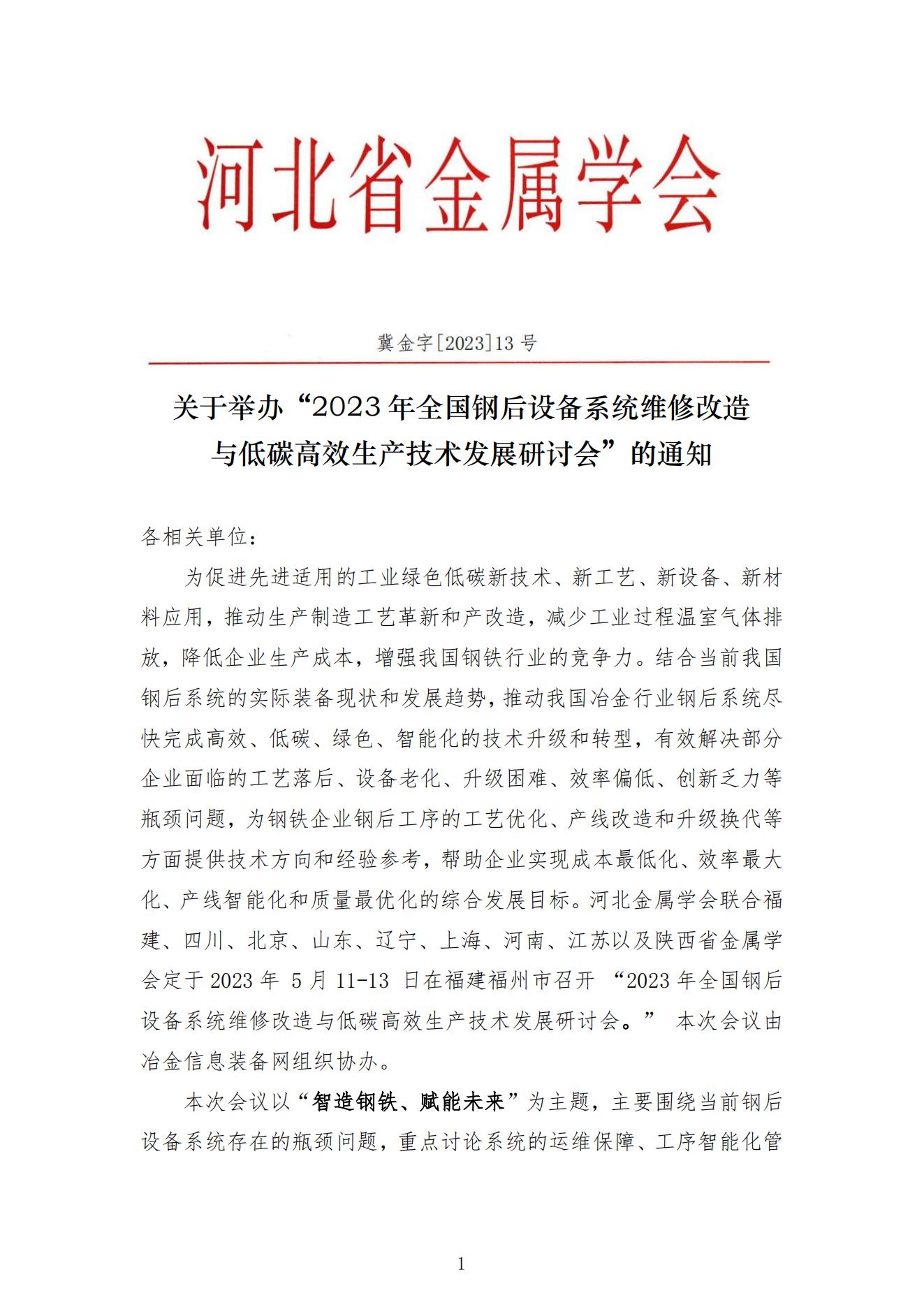 冀金字[2023]13号2023年全国钢后设备系统维修改造与低碳高效会议通知