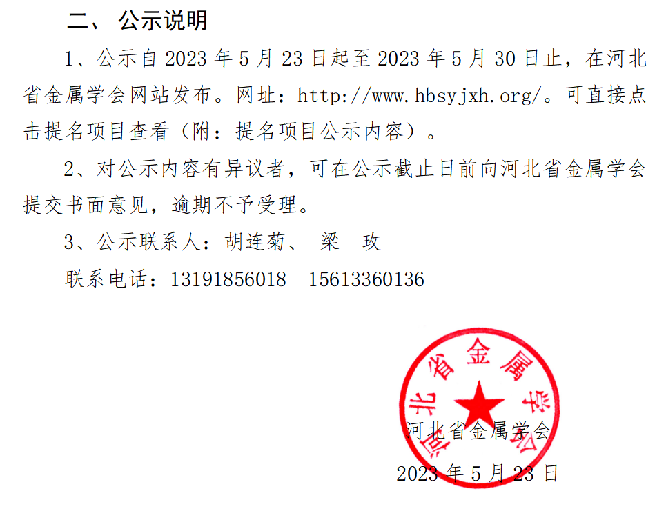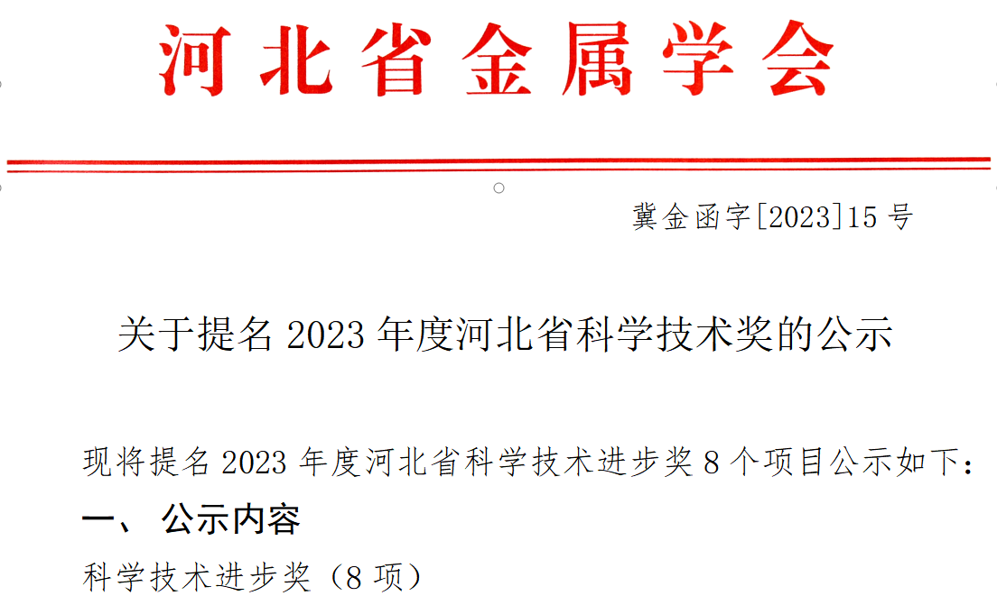 冀金函字[2023]15号关于提名2023年度河北省科学技术奖的公示