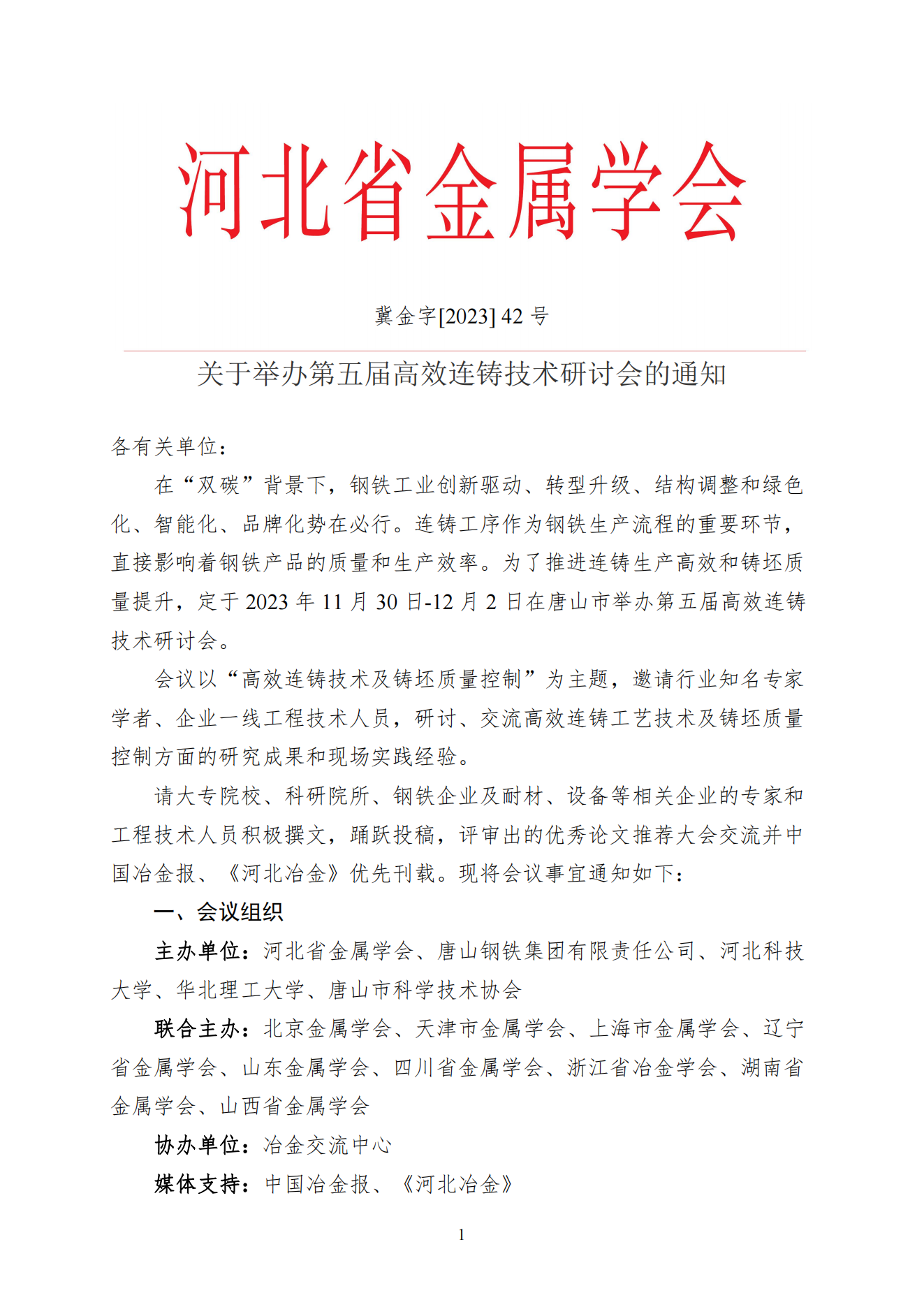 冀金字[2023]42号第五届高效连铸技术研讨会通知