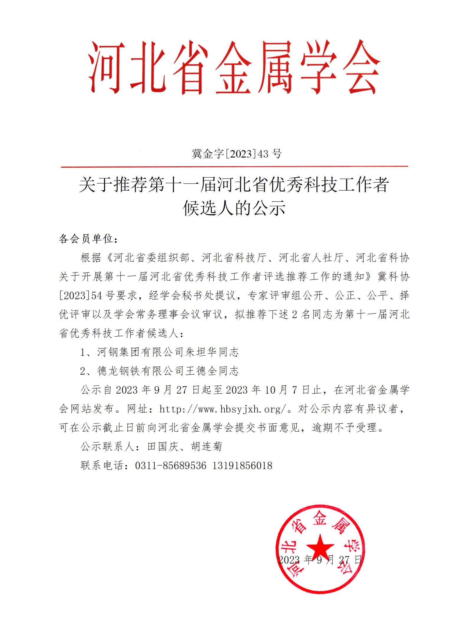 冀金字[2023] 43号关于推荐第十一届河北省优秀科技工作者候选人的公示