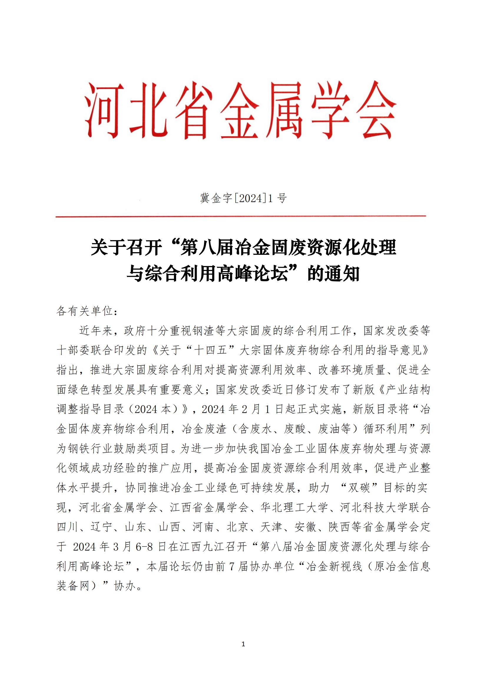 冀金字[2024]1号关于召开“第八届冶金固废资源化处理与综合利用高峰论坛“的通知