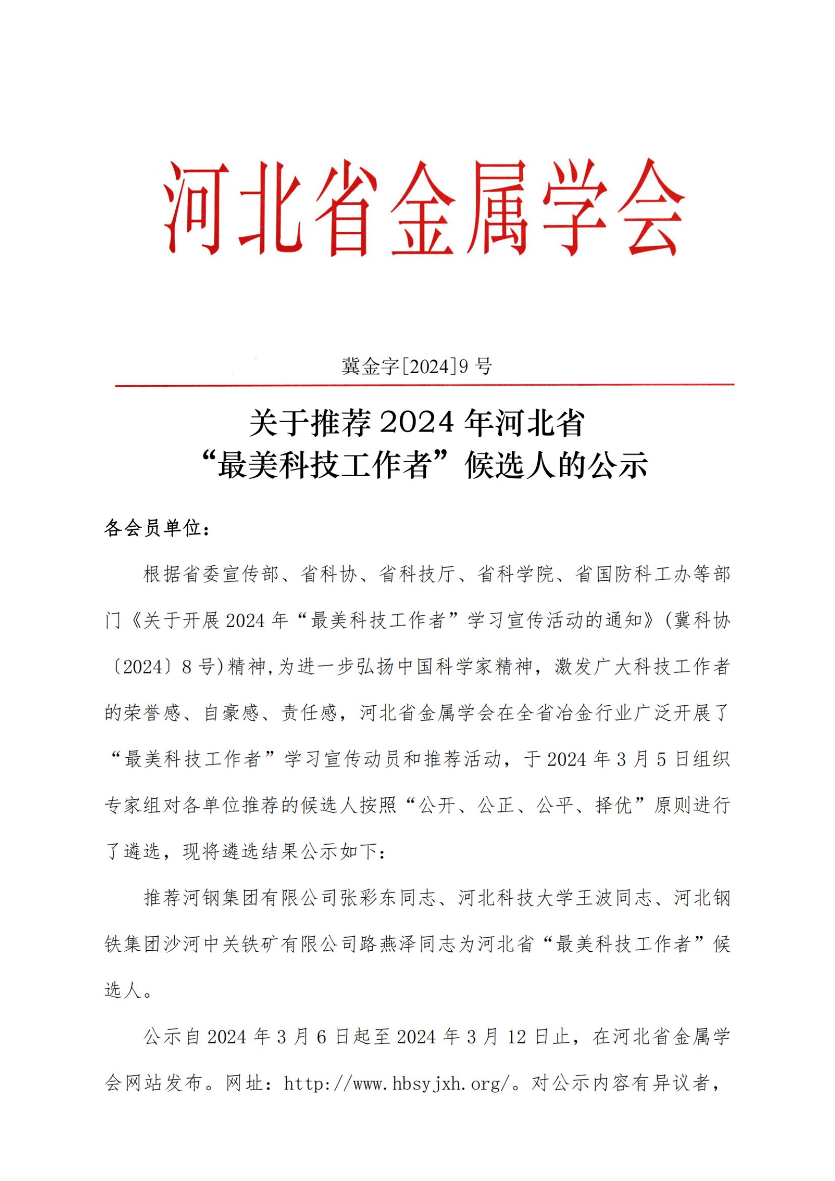 冀金字[2024]9号关于推荐2024年河北省最美科技工作者候选人的公示