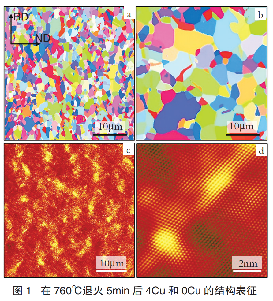 研究人员分别从退火温度和时间两个维度分析了超细晶组织的稳定性。图2a和2b显示,在760℃下保温1h后,4Cu的平均晶粒尺寸仅从5min退火后的0.8µm长大到1.3µm,而0Cu的平均晶粒尺寸从2.1µm增长到了5.7µm。当温度从760℃上升到910℃时,4Cu的平均晶粒尺寸仅从0.8µm长大到1.4µm,超细晶组织极其稳定,而0Cu的平均晶粒尺寸从2.1µm长大到了6.3µm,如图2c和2d所示。以上结果表明,无序共格析出还可以大幅度提高纳米材料、超细晶材料的组织热稳定性。