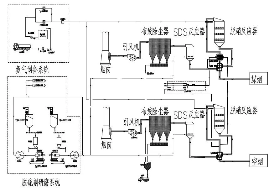 4、采用适用于加热炉烟气脱硫的小苏打工艺,该工艺是将磨制的小苏达粉在烟气中喷射后迅速分解膨化,增加了比表面积,活性增加,提高脱硫效率。脱硫后烟气无废水产生,脱硫灰随烟气由袋式除尘器收集。具有节能、运行费用低、固废产生量小等优点。