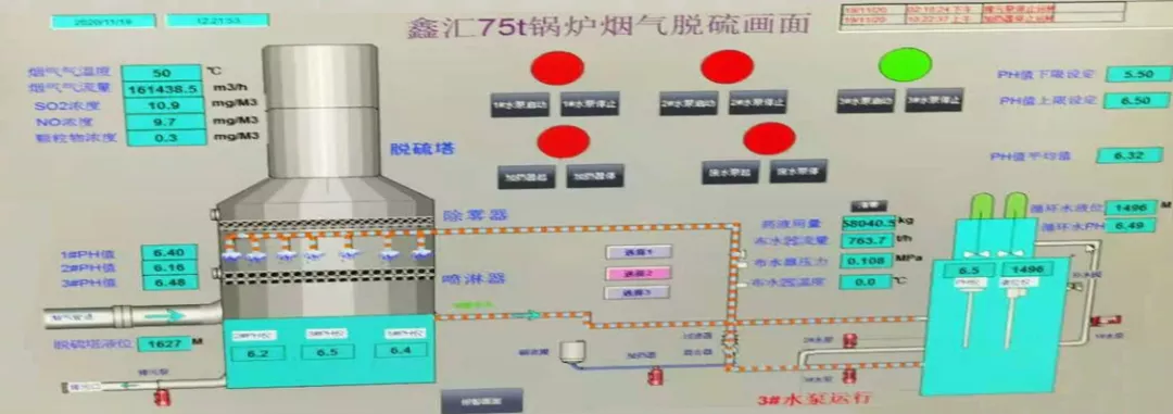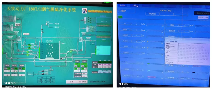 天铁180吨锅炉烟气处理项目天铁项目按照2021年河北地区新标准设计,2021年6月后执行新标准二氧化硫含量小于10mg/Nm3。下面是5月28日的实际运行工况计算机和检测后台画面。