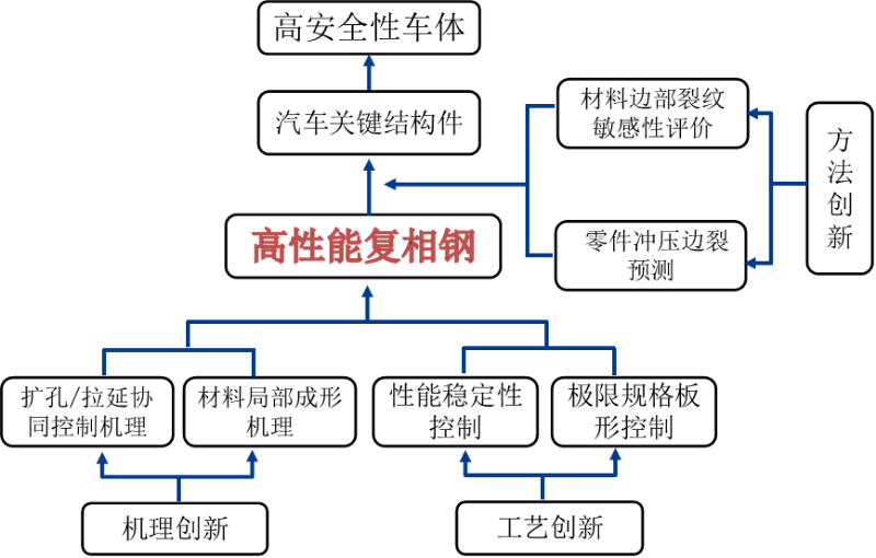 本项目以高性能复相钢使用需求为出发点,总体思路如图1所示。通过扩孔/拉延协同控制和材料局部成形的机理创新,提出组织调控新思路,实现复相钢综合力学性能提升;通过轧制工艺、退火工艺、板形控制工艺等创新,实现复相钢性能稳定性、极限规格产品板形质量的提升,在上述机理创新和工艺创新的基础上,最终实现高性能复相钢的稳定生产。另外,为解决复相钢零部件生产过程中的关键瓶颈问题,建立材料边部裂纹敏感性评价方法和基于零件成形方式的冲压边裂预测方法,保障汽车关键结构件的稳定生产,从而满足整车轻量化、安全化的需求。