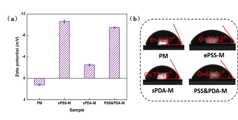 图4改性膜表面Zeta电位及接触角变化情况