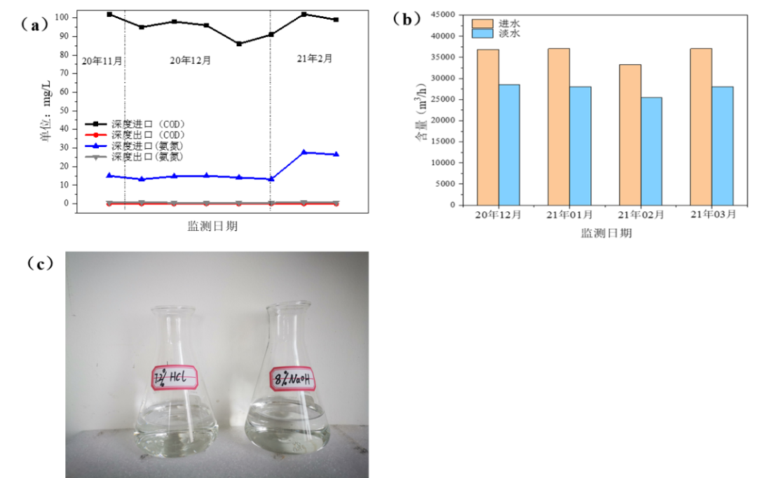 图9浓盐水资源化处理回用淡水水质、淡水产率及再生酸碱产品