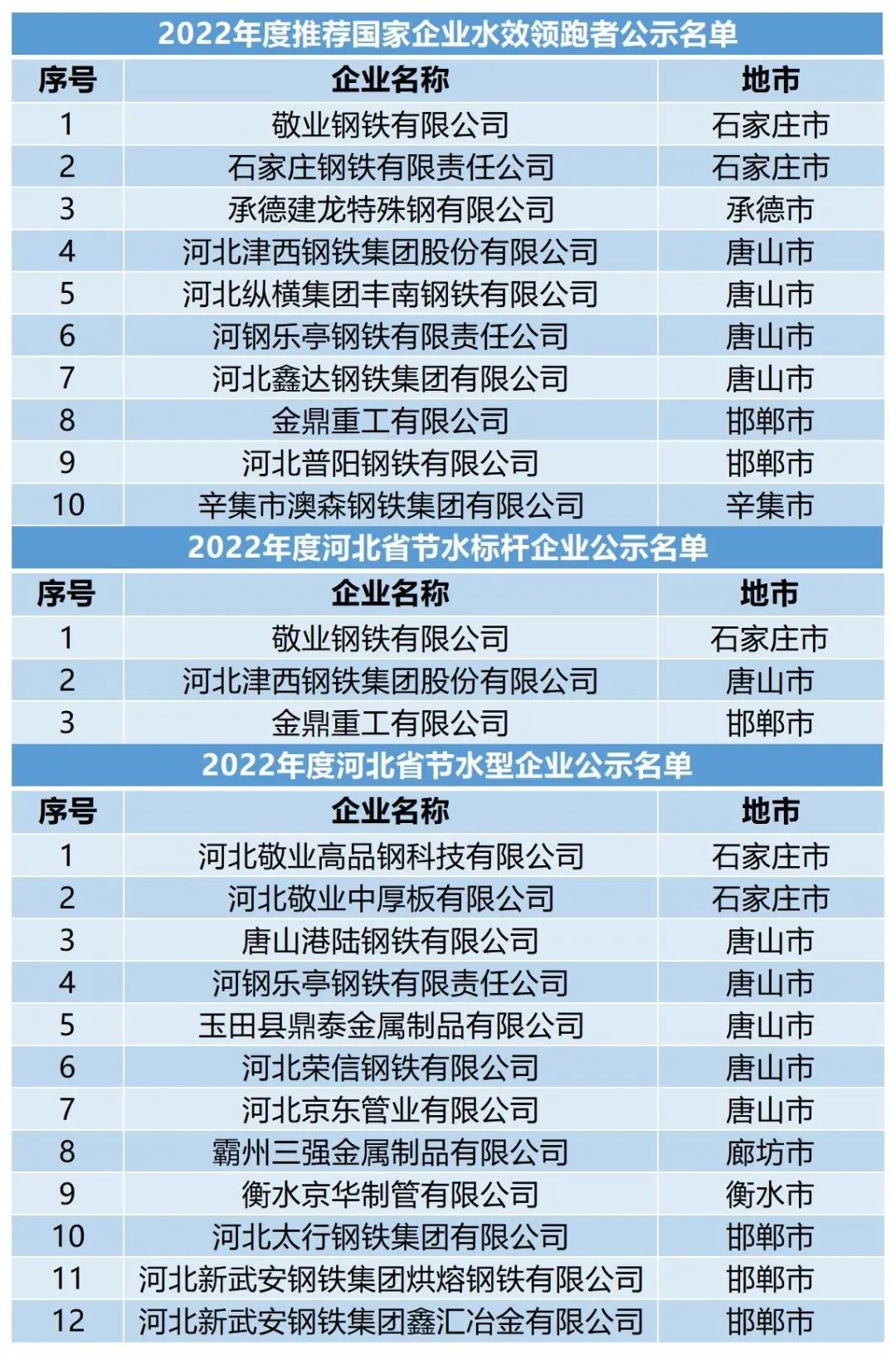近日,河北省工业和信息化厅网站公示2022年国家级水效领跑者遴选推荐和省级节水型企业、节水型园区拟入选名单。其中,10家钢企入选2022年度推荐国家企业水效领跑者名单,3家企业入选2022年度河北省节水标杆企业名单,12家企业入选2022年度河北省节水型企业名单。
