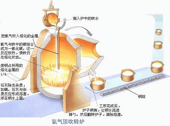 生铁中的各种杂质,在高温环境下,不同程度上都与氧有较大的亲和力。因此可以利用氧化的方法使它们成为液体、固体或气体氧化物,液体和固体氧化物在高温下与炉衬和加入炉内的熔剂进行反应,结合成炉渣,并在扒渣时被排除炉外,气体也在钢水沸腾时被CO带到炉外。